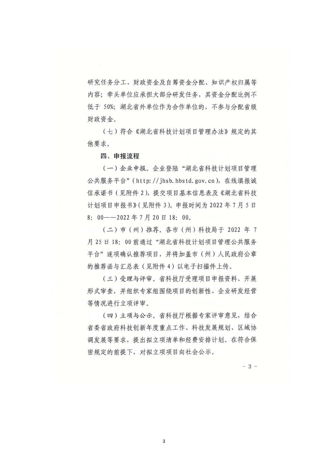 (一)企业申报。企业登陆“湖北省科技计划项目管理公共服务平台”(http://jhsb.hbstd.gov.cn),在线填报诚信承诺书,提交项目基本信息表及《湖北省科技计划项目申报书》。网上申报截止时间为2022年7月20日18:00。