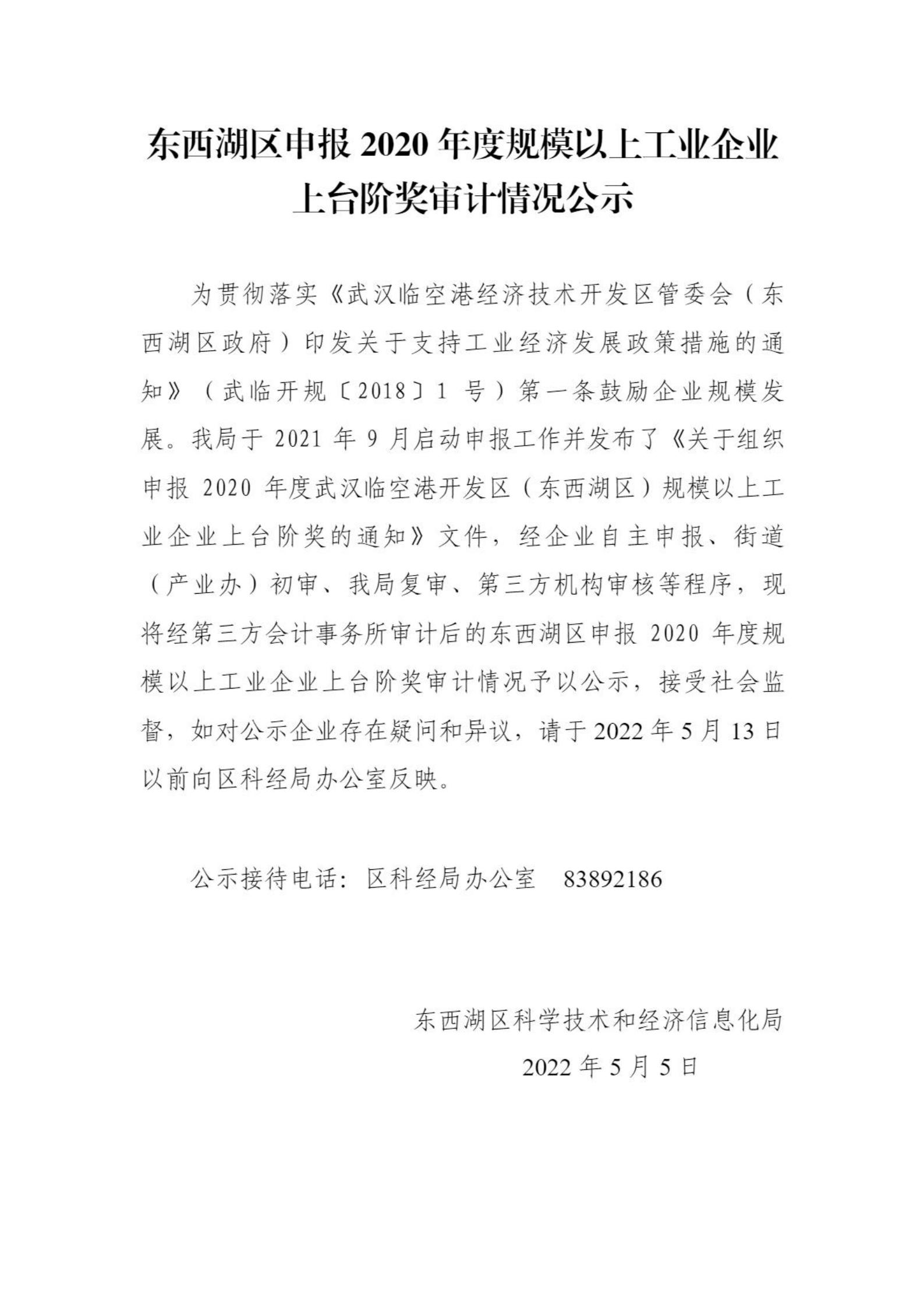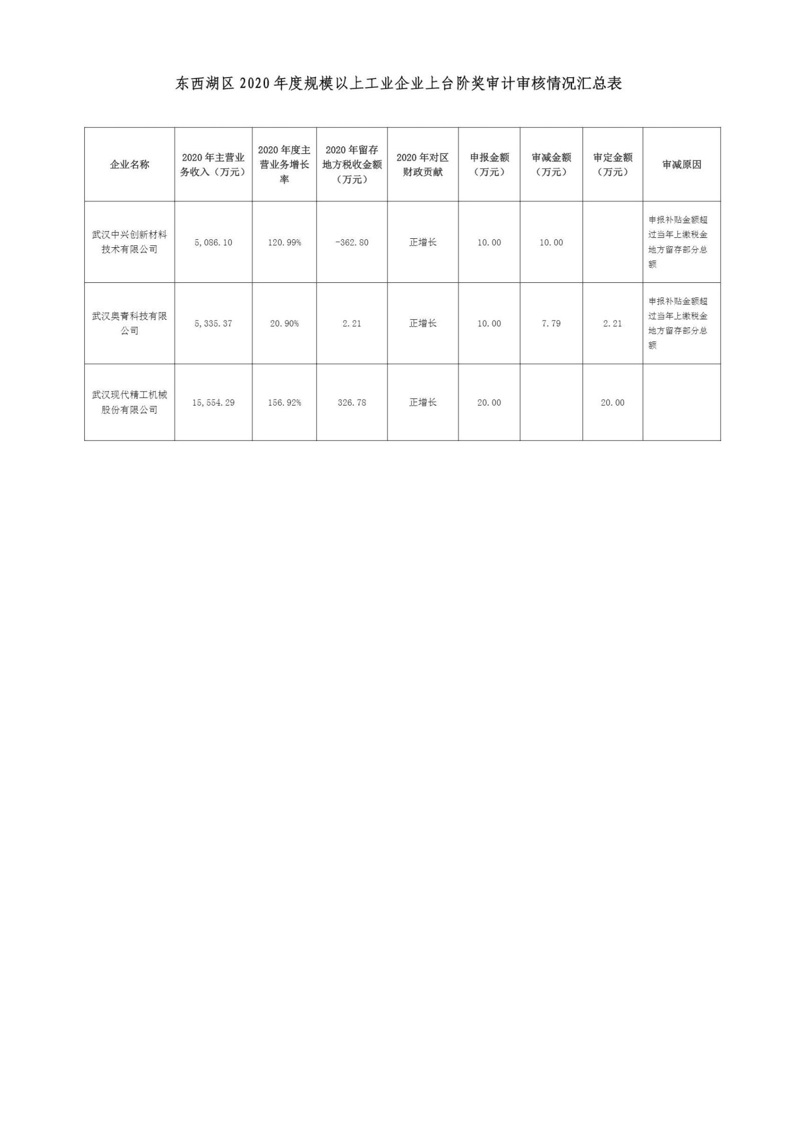 东西湖区申报2020年度规模以上工业企业上台阶奖审计情况公示