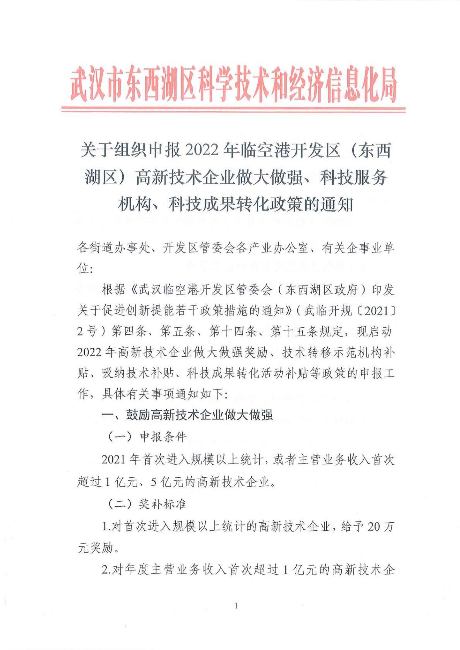 关于组织申报2022的临空港开发区(东西湖区)高新技术企业做大做强、科技服务机构、科技成果转化政策的通知